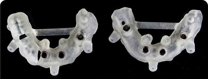 手術用サージカルガイドほんの少しのずれが大きく影響してしまうインプラント治療ですが、サージカルガイドを使うことでコンピュータで設計した位置に高い精度でインプラントを埋入することができます。